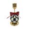 A decorative ornament featuring a checkered black and white sphere with a red bow, resting on a golden base and topped with a golden cup-shaped element. The bold pattern and metallic accents create a striking focal point for mantelpieces or tables.
