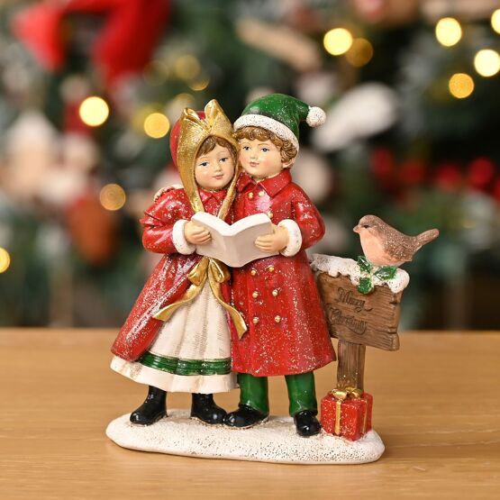 Resin Christmas Boy and Girl Carolling Figurine- 13cm
