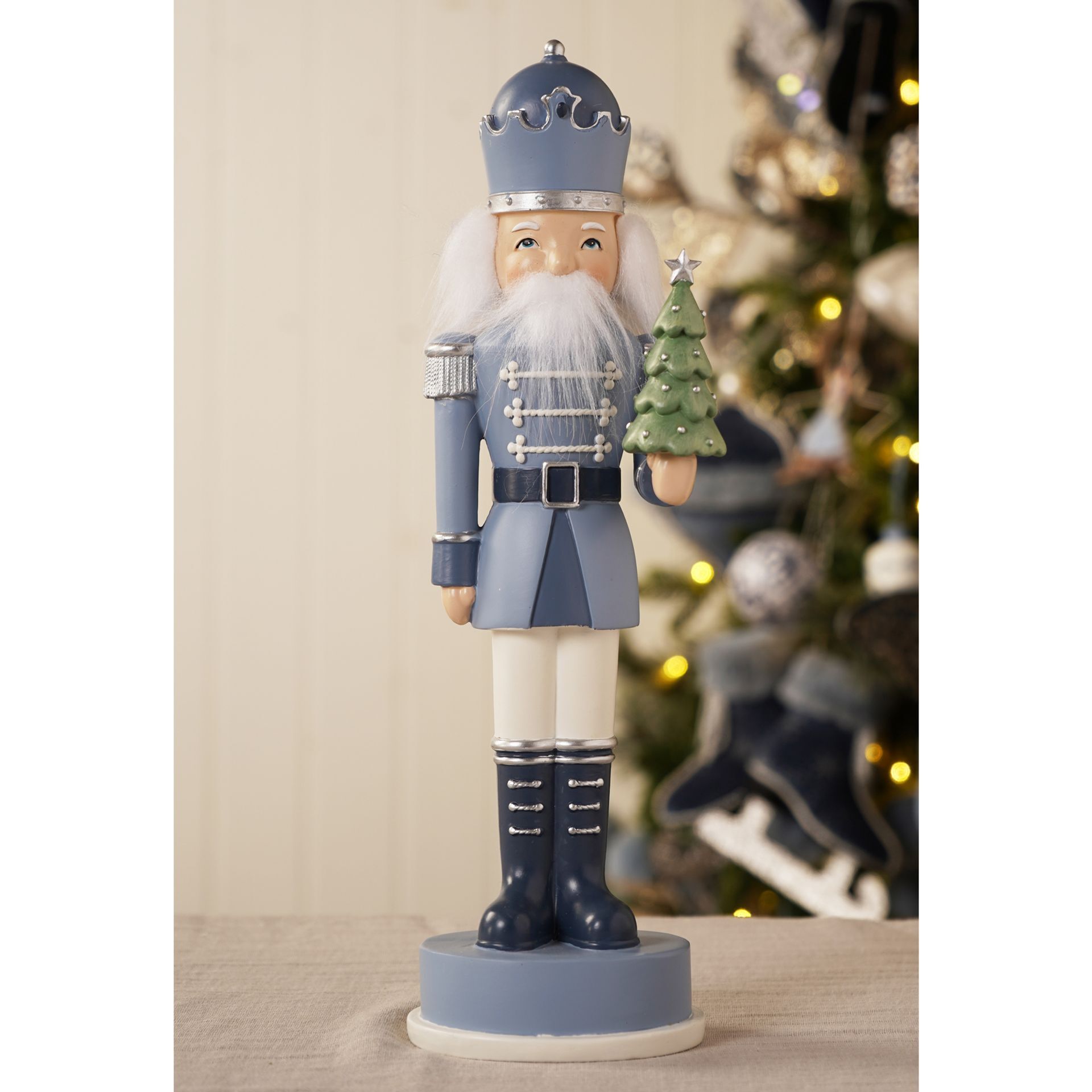 Wearing a blue uniform and holding a small tree, this nutcracker’s fine detailing and clean lines suit mantel, shelf, or window arrangements. Its muted palette complements both traditional and contemporary interiors.