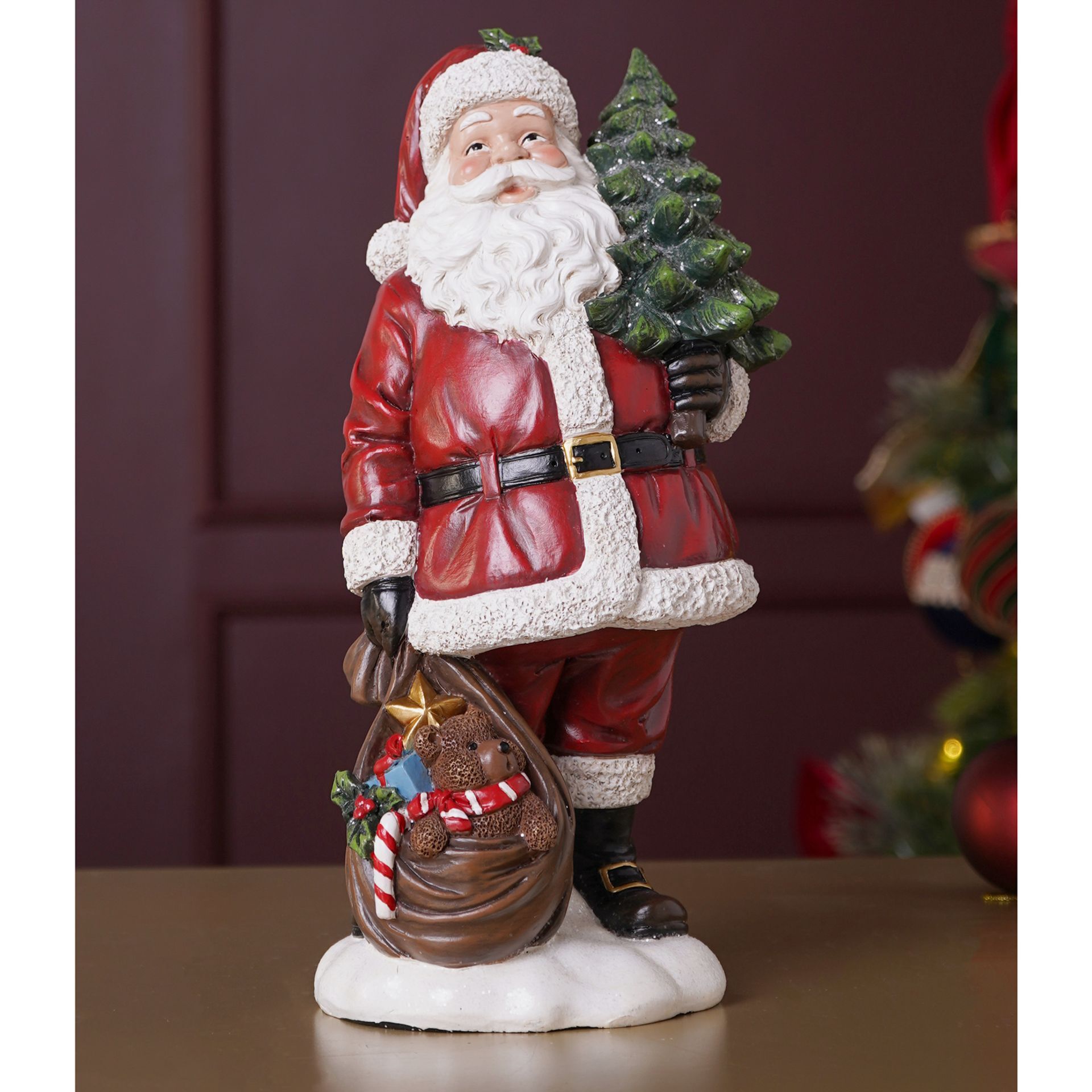 A jolly Santa Claus figure stands in the foreground, holding a small Christmas tree in one hand and a sack of presents in the other. Crafted from resin, the piece features traditional red and white tones with subtle gold accents, capturing a sense of warmth and nostalgia.