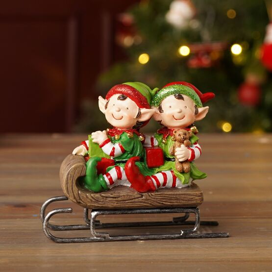 The Two Elves On Sleigh Figurine captures the spirit of festive fun with a playful, nature-inspired twist.