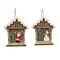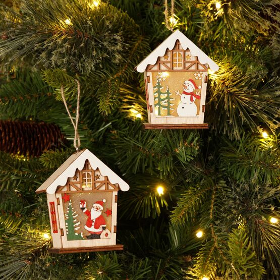 Two wooden ornaments shaped as cosy houses, one with a cheerful Santa Claus and the other with a friendly snowman, showcase snowy landscapes and festive decor through their windows. Each piece lights up, adding a gentle glow to seasonal displays.