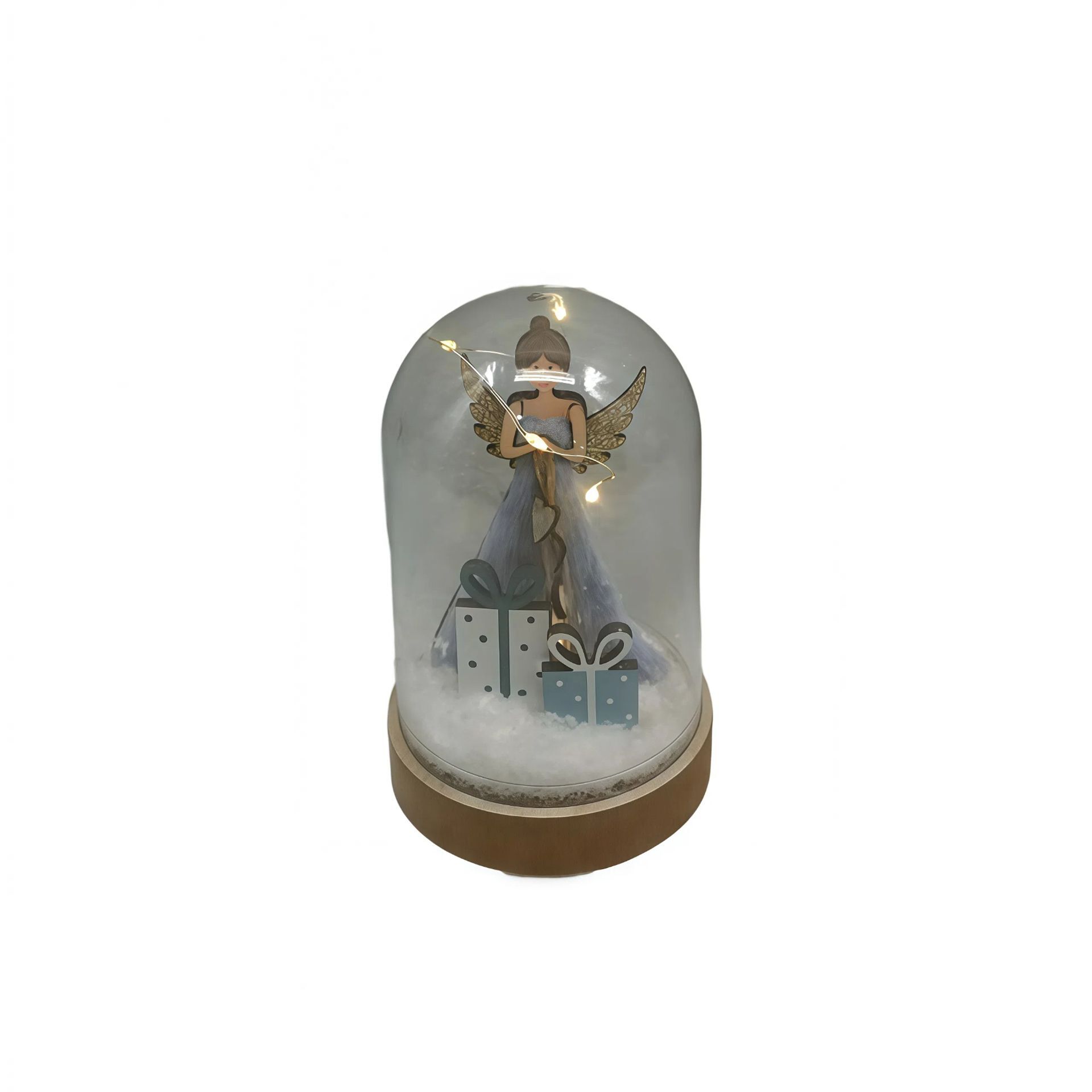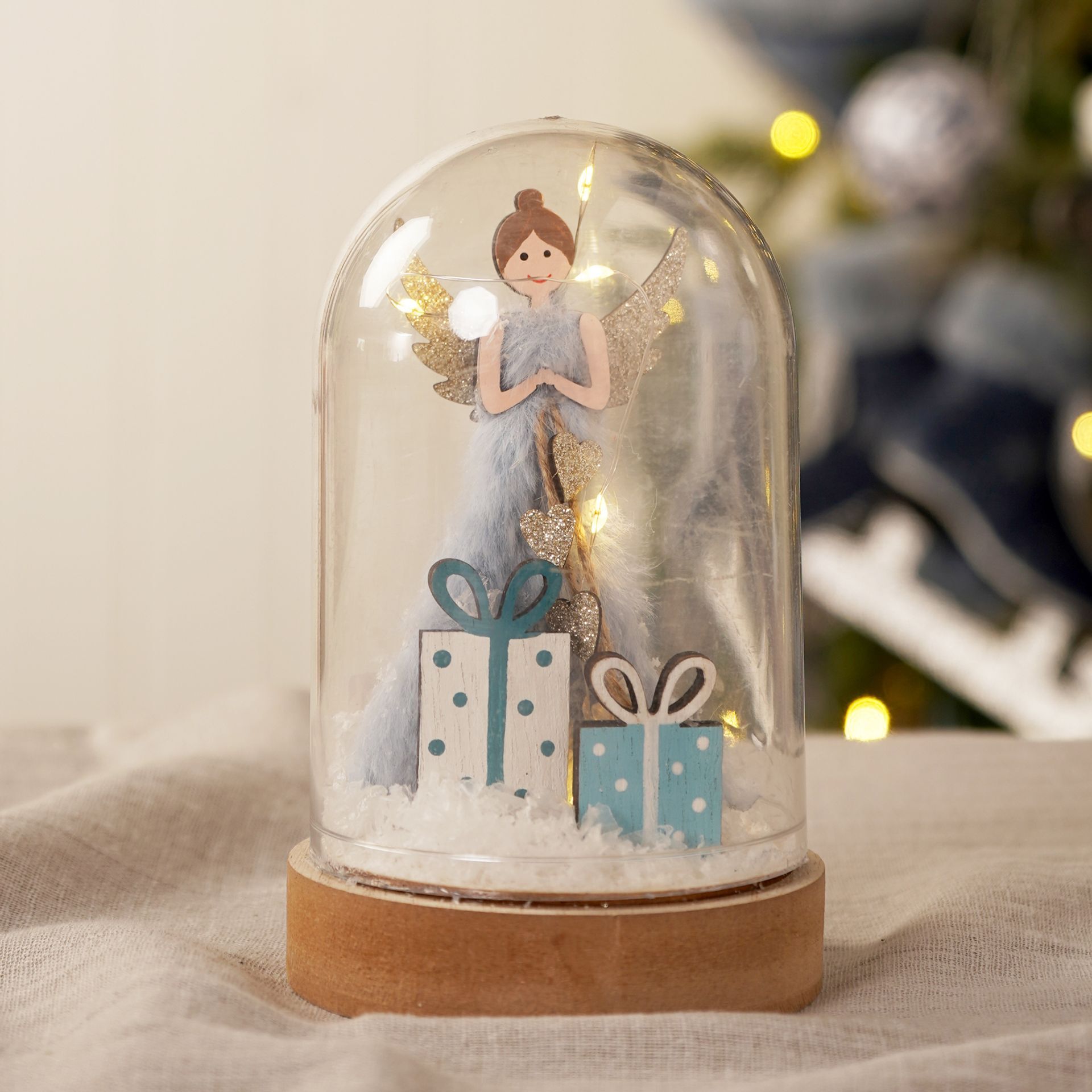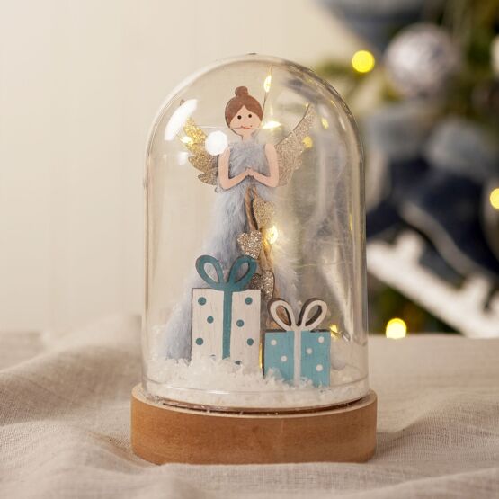 Presented under a clear dome, a delicate angel in blue stands among wrapped gifts on a snow-like base, surrounded by gentle LED lighting.
