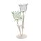 The Hestia 2 Stem Candle Holder With Green Glass And Butterflies On Matte Off White Base, features tulip-shaped glass cups in soft green and white. The matte off-white base is adorned with metal butterfly accents, adding enchantment to any space.