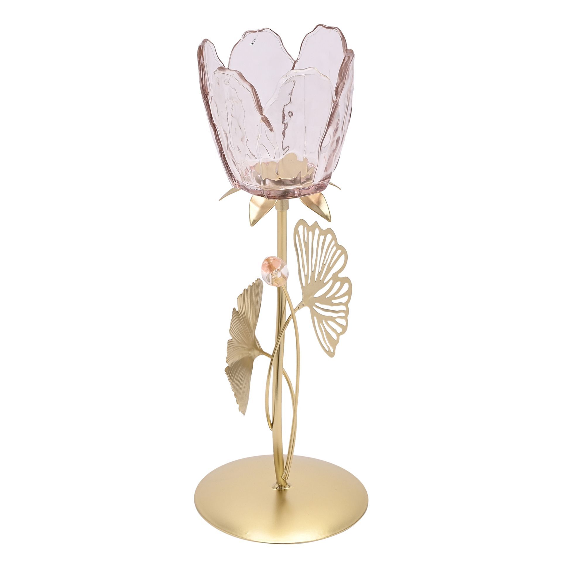 Elevate your décor with the Hestia Single Stem Candle Holder, a stunning centrepiece that marries blush pink glass with a luxurious gold base. This exquisite ornament evokes the beauty of a single flower in bloom, casting an enchanting glow with your favourite tealight or votive candle.