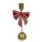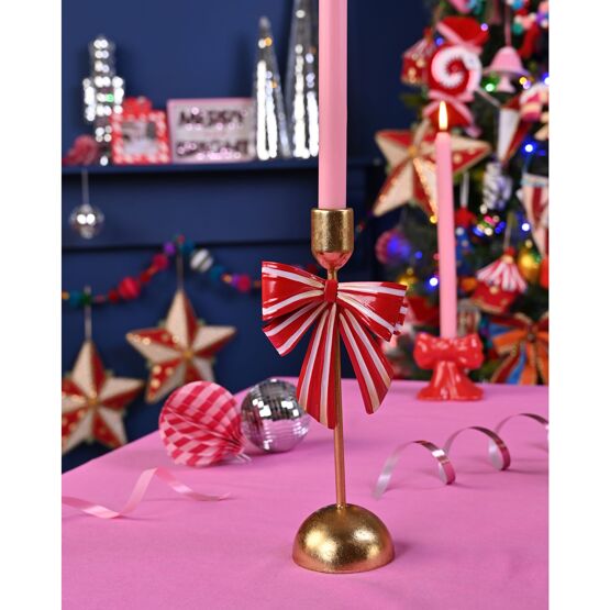 A golden candlestick with a red and white striped, fan-shaped bow brings kitsch-meets-circus flair, striking against its clean form. Crafted in metal, it mixes confidence and colour for tables, mantels, and festive centrepieces.