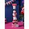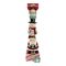 A stacked arrangement of festive figurines, including a snowman, a gift-bearing elf and Santa, appears in vibrant red, green and white with clashing patterns and character sparkle.