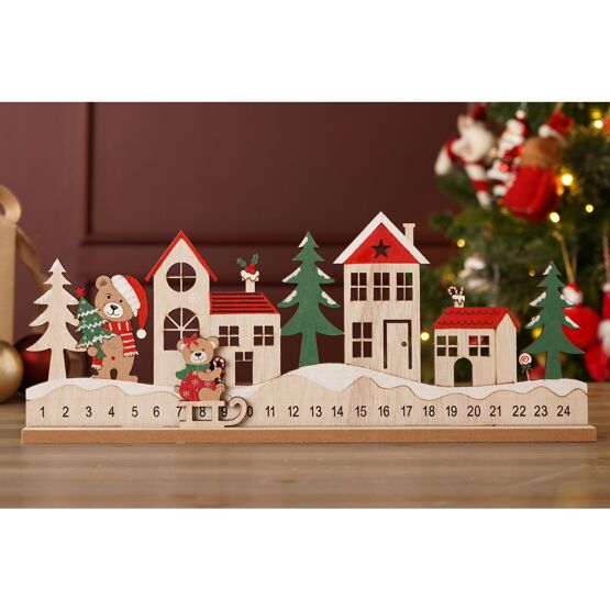 A wooden advent calendar with a winter village scene, featuring charming houses, snow-dusted trees, and a cheerful Santa Claus figure, all watched over by a pair of cuddly teddy bears. Finished in soft, festive colours, it offers a tactile and inviting centrepiece for seasonal celebrations.