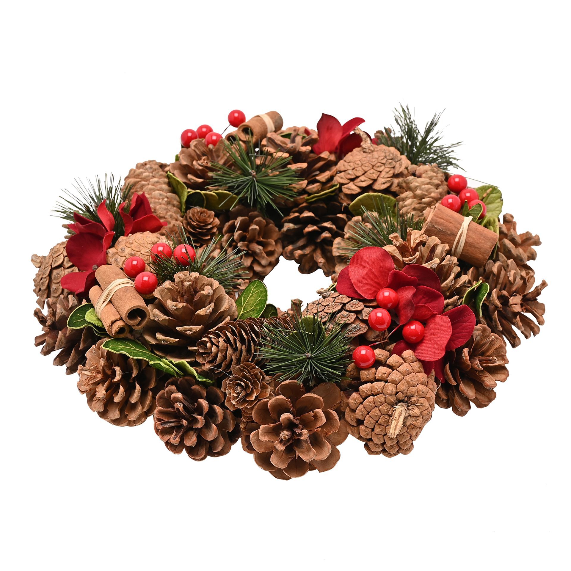 Create a nature-inspired seasonal space with our Cinnamon Wreath, a 30cm piece featuring a blend of pine cones, faux red flowers and foliage.