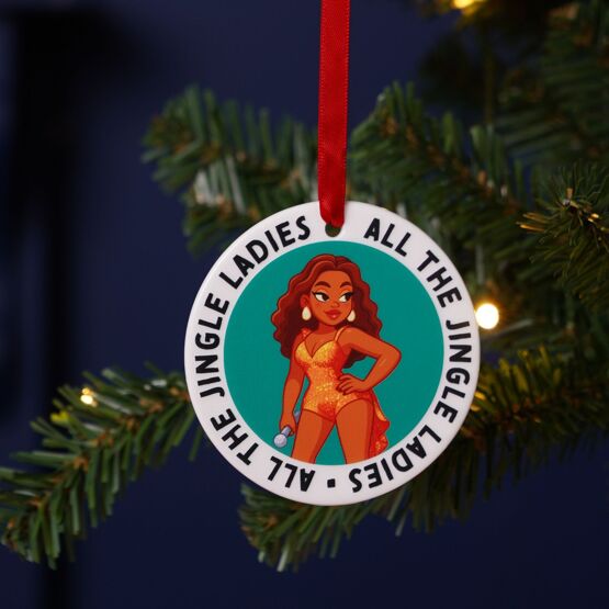 A circular ornament featuring a cartoon-style illustration of a woman surrounded by the text "All The jingle ladies, all the jingle ladies", finished with a gold ribbon for easy hanging.
