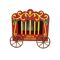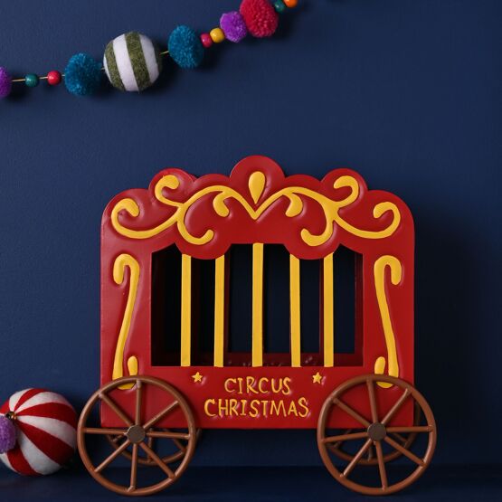 A colourful and ornate circus-themed Christmas wagon with intricate designs and decorations, including a 'Circus Christmas' sign. Crafted in metal, it pops with vibrant hues, clashing patterns and playful trims that wink to fairground fun.