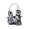 This playful ornament features a group of adorable penguin figurines, each dressed in cheerful Santa hats and colourful scarves, gathered around wrapped gifts and a decorative wreath. The design captures a sense of joyful celebration with vibrant colours and whimsical details.