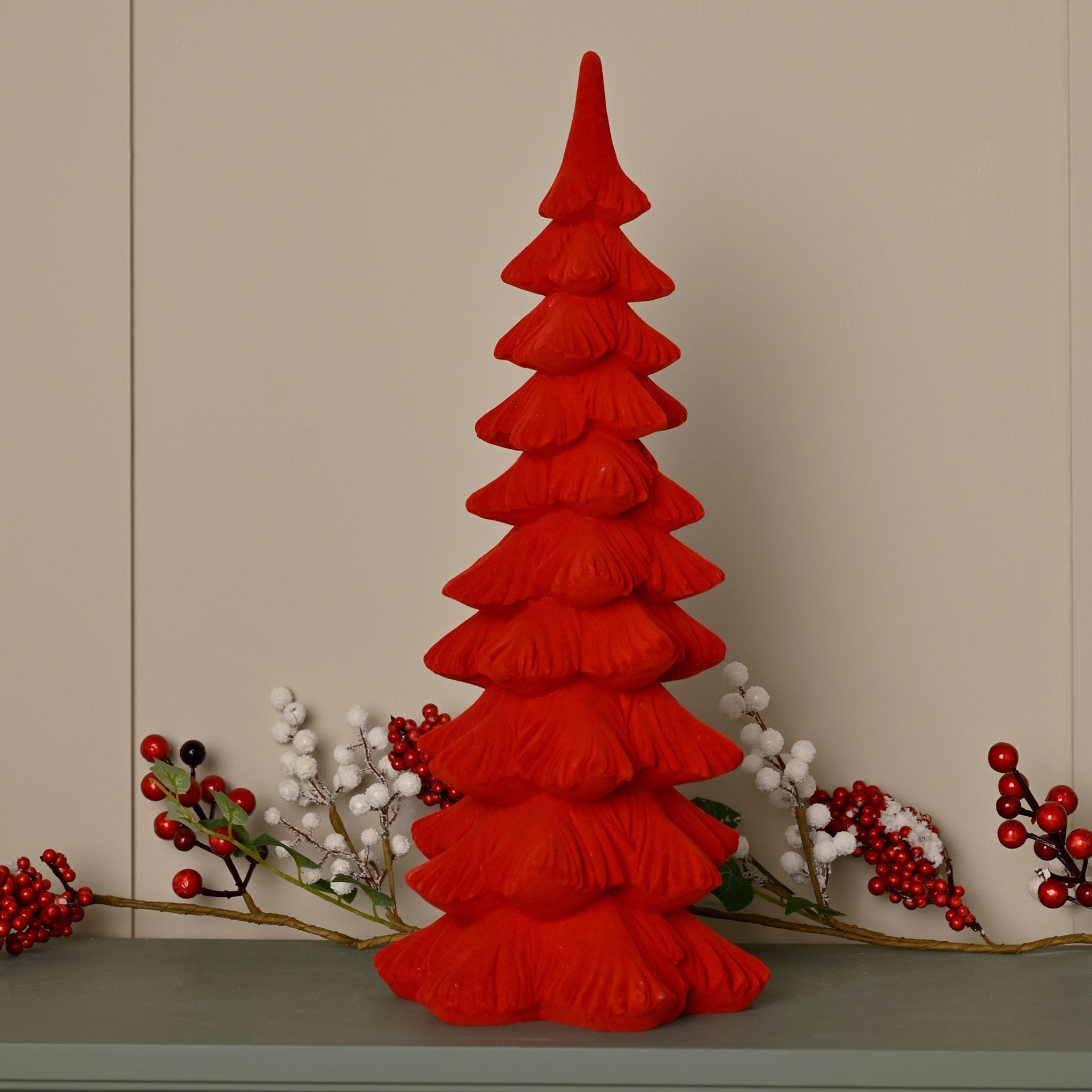Rich red flocking and structured layers create a contemporary take on a festive classic, sized for shelves, tables or feature windows. Ideal for pairing with natural woods and greenery.