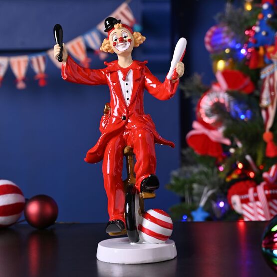 A colourful clown in a bright red suit balances candy striped pins, baton in hand, on a crisp white base, cast in resin for characterful detail. Retro showtime touches bring circus-meets-Christmas energy with a cheeky wink.