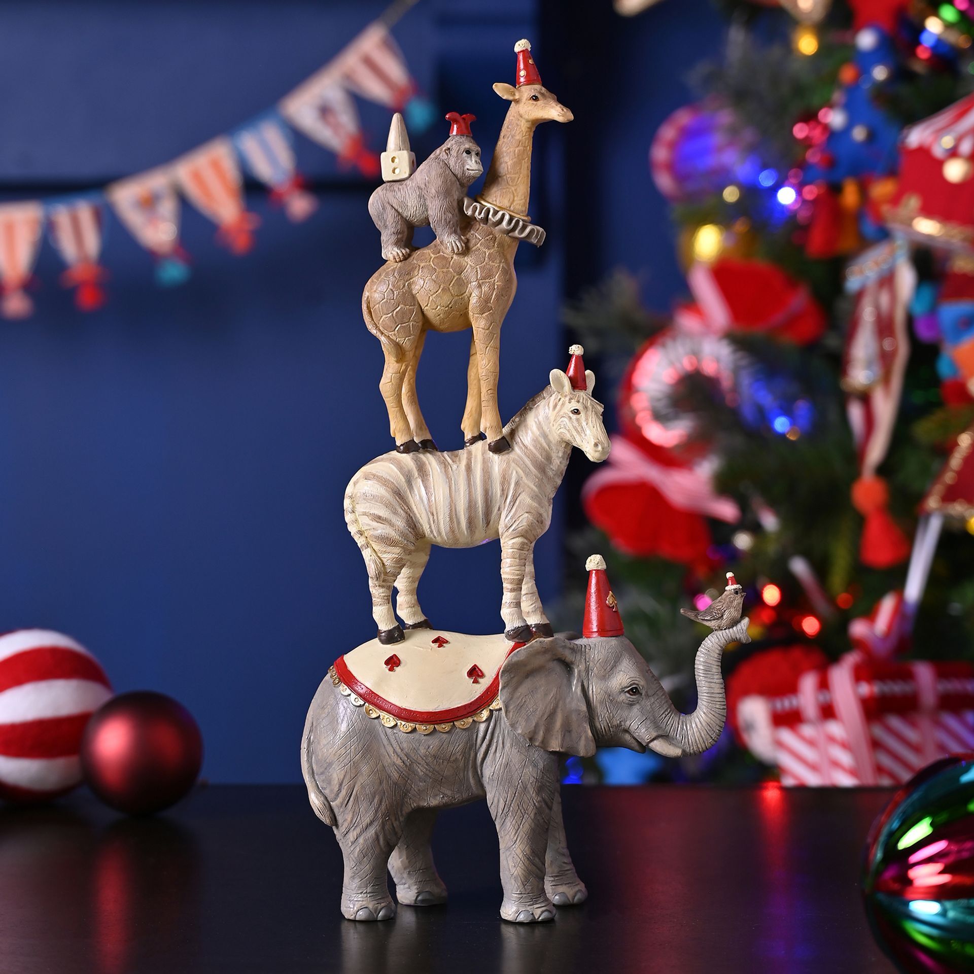 An elephant anchors the stack, with a zebra, giraffe and cheeky monkey balanced above, dressed in bright hues and quirky accessories. Smooth resin gives crisp detail and a glossy finish, channelling circus-meets-Christmas energy.