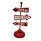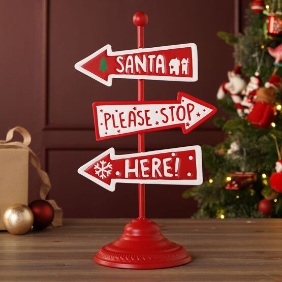 A red and white directional sign post with various Christmas-themed arrows pointing in different directions, including "Santa", "Please stop", and "Here!" creates a cheerful, tongue-in-cheek centrepiece. The metal finish adds a modern edge to its nostalgic inspiration.