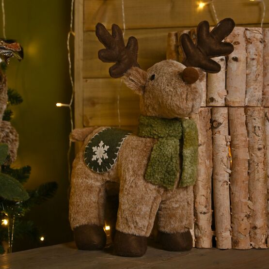 A plush toy reindeer with a green scarf is finished in warm, earthy tones and soft textures, adding a touch of fun woodland charm to any space.
