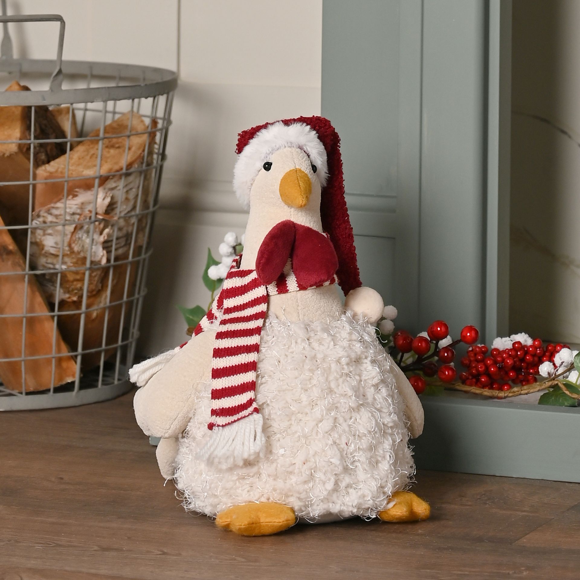 A fluffy white rooster in a red hat and striped scarf delivers both weight and whimsy, sized for porches, hallways or shop floors. Soft textures support a handcrafted story.
