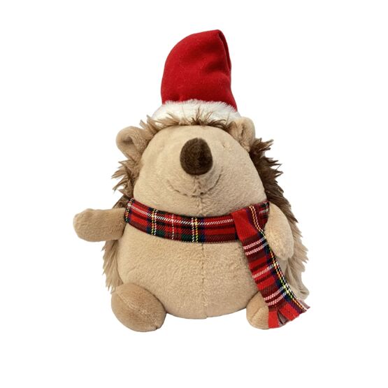 A plush, beige-coloured hedgehog doorstop dressed in a vibrant red Santa hat and a red and black plaid scarf, lending a playful touch to its soft, tactile form.