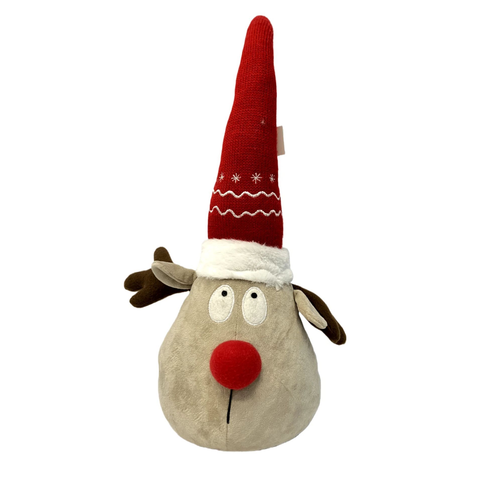A plush door stop in the shape of a reindeer with a red nose and a tall red hat creates a playful accent, delighting with cosy textures and gentle colours.