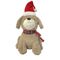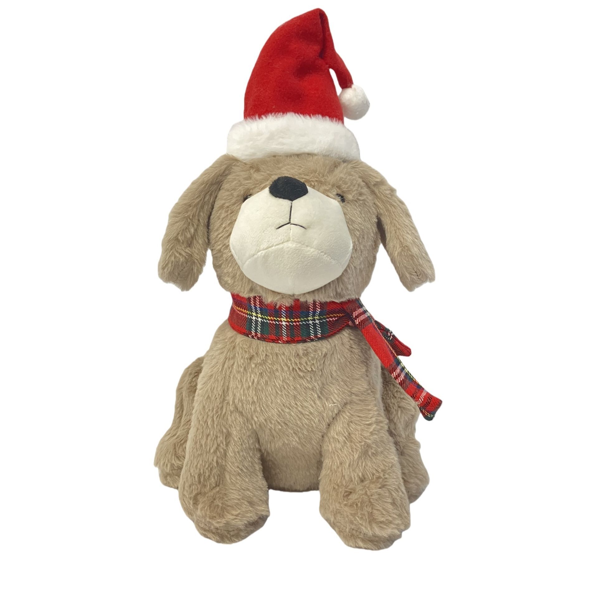 A plush, beige-coloured dog doorstop wears a vibrant red Santa hat and a classic tartan scarf, capturing a cheerful personality and soft texture. The charming design brings a sense of warmth and whimsy to any doorway.