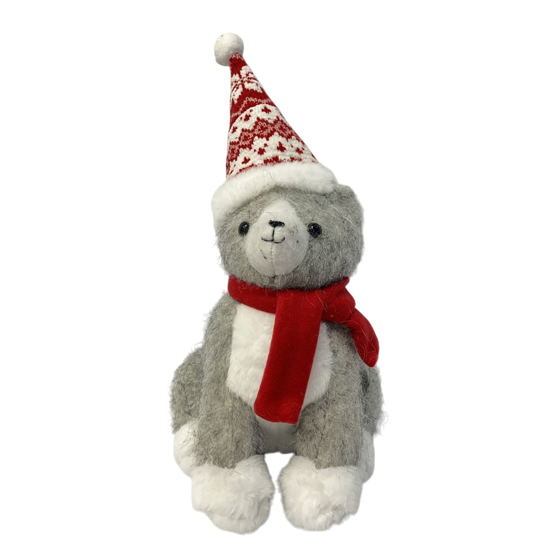 Designed in soft grey and white plush, this charming cat doorstop features a red and white patterned Christmas hat and matching scarf, capturing a cosy seasonal spirit.