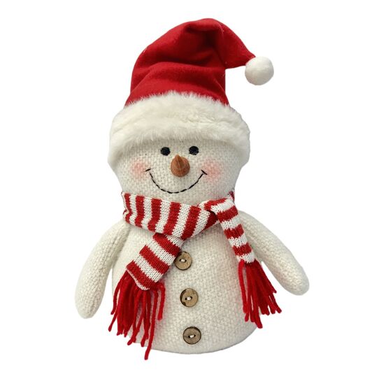 This cheerful snowman doorstop adorned with a red Santa hat and striped scarf, adds a delightful touch of personality to your décor.