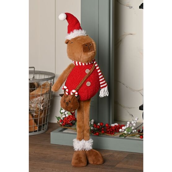 A plush capybara in a striped scarf and Santa hat holds candy canes, bringing height and festive colour to shelves, mantels or windows. Suits rustic storytelling and gifting.