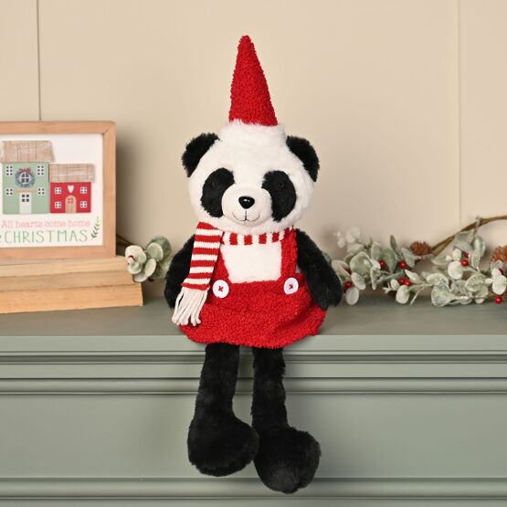 This plush panda bear, dressed in a cozy red hat and scarf, sits with soft, dangling legs that add character to shelves, mantels, or windowsills.
