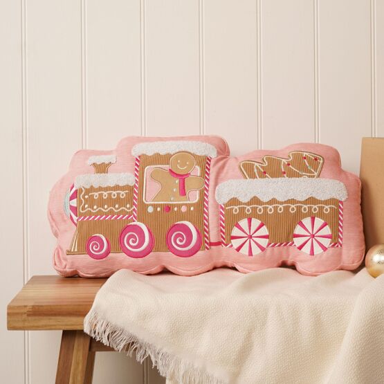 The Pink Gingerbread Train Shaped Cushion in Chenille Fabric delivers a playful twist on classic Christmas comfort.