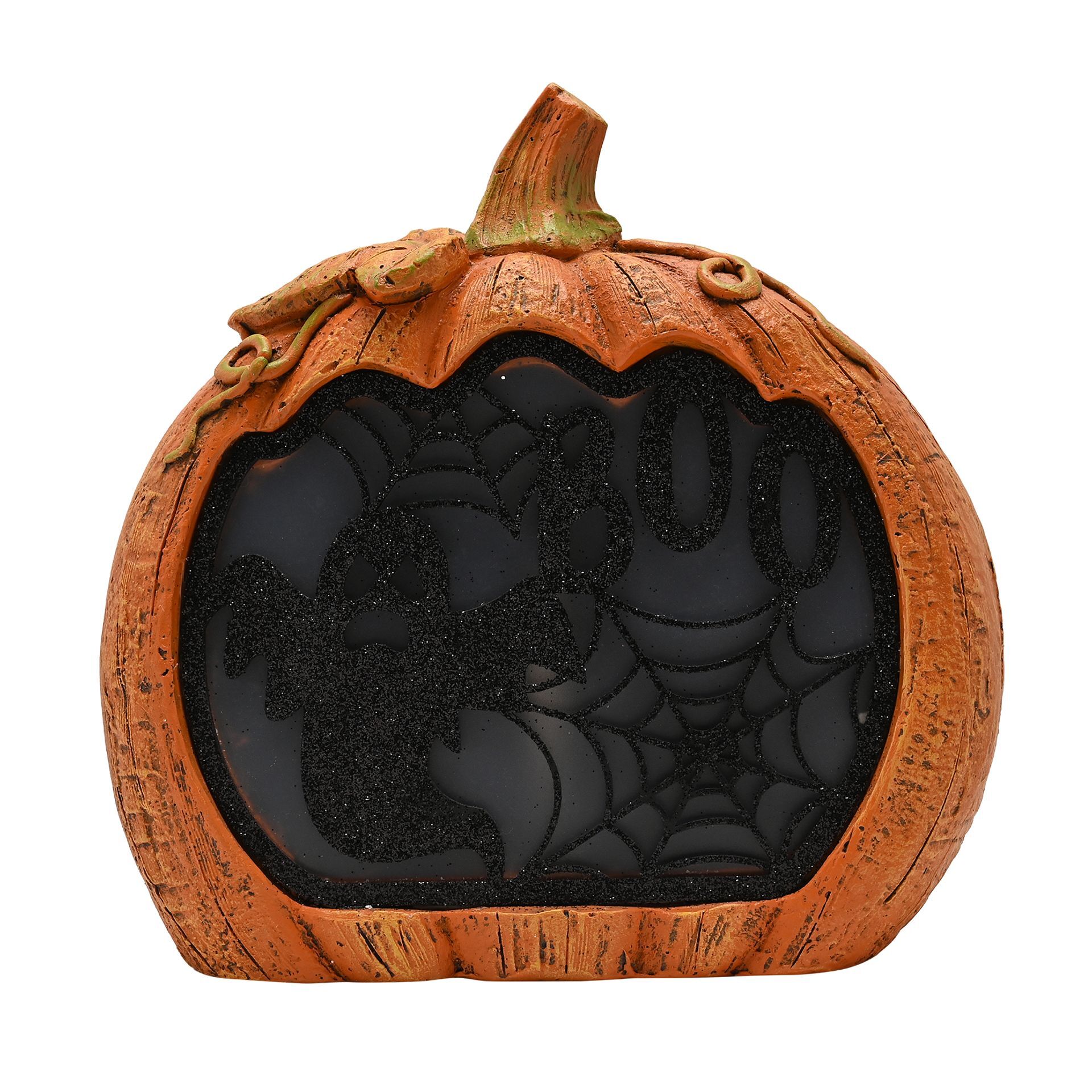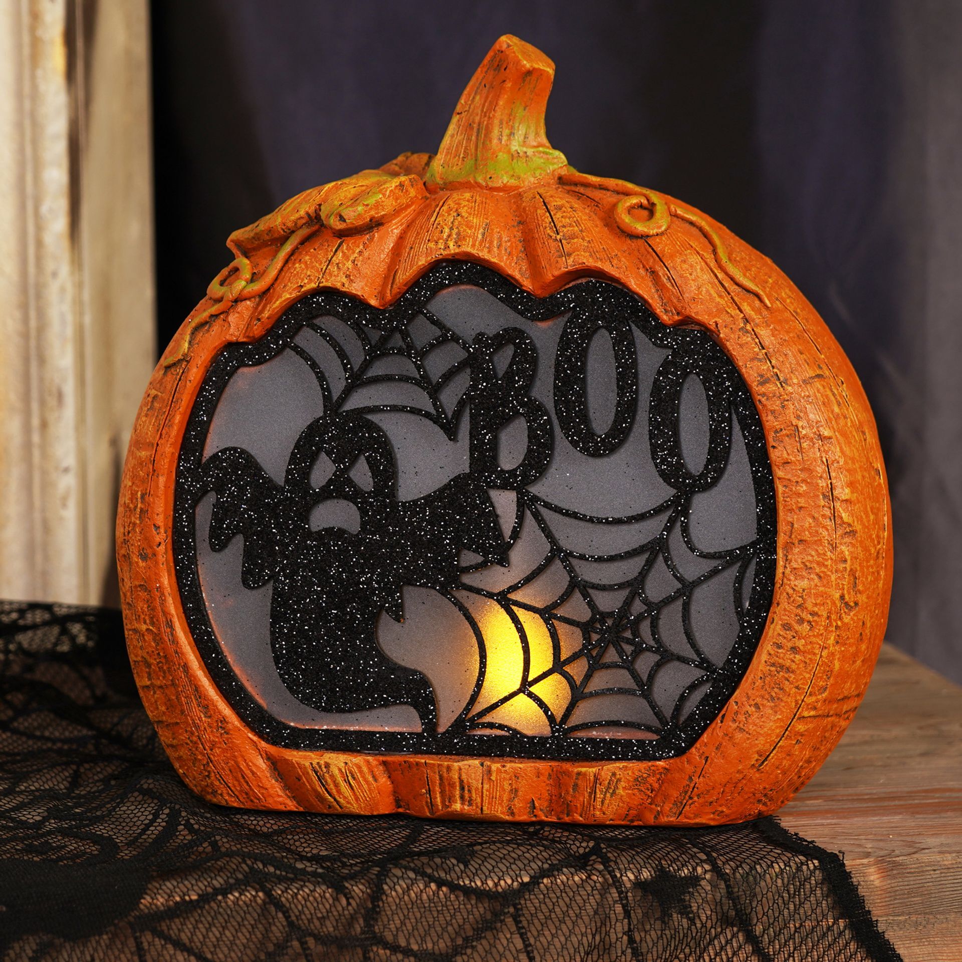 Bring a hint of eerie elegance to any setting with this boo design magnesia pumpkin with led flame (try me button), designed to enhance Halloween displays. Its detailed finish and seasonal styling create a balanced blend of charm and subtle spookiness. A versatile decorative item suited to a wide range of Halloween-inspired settings.