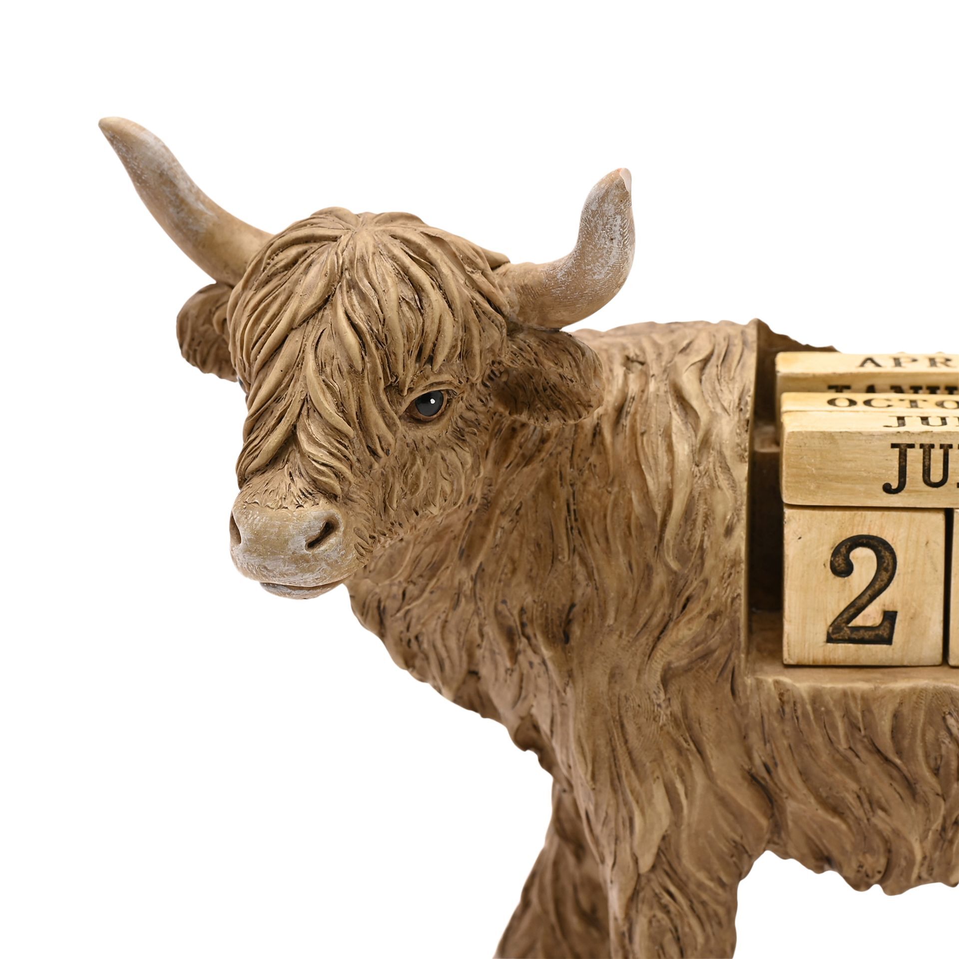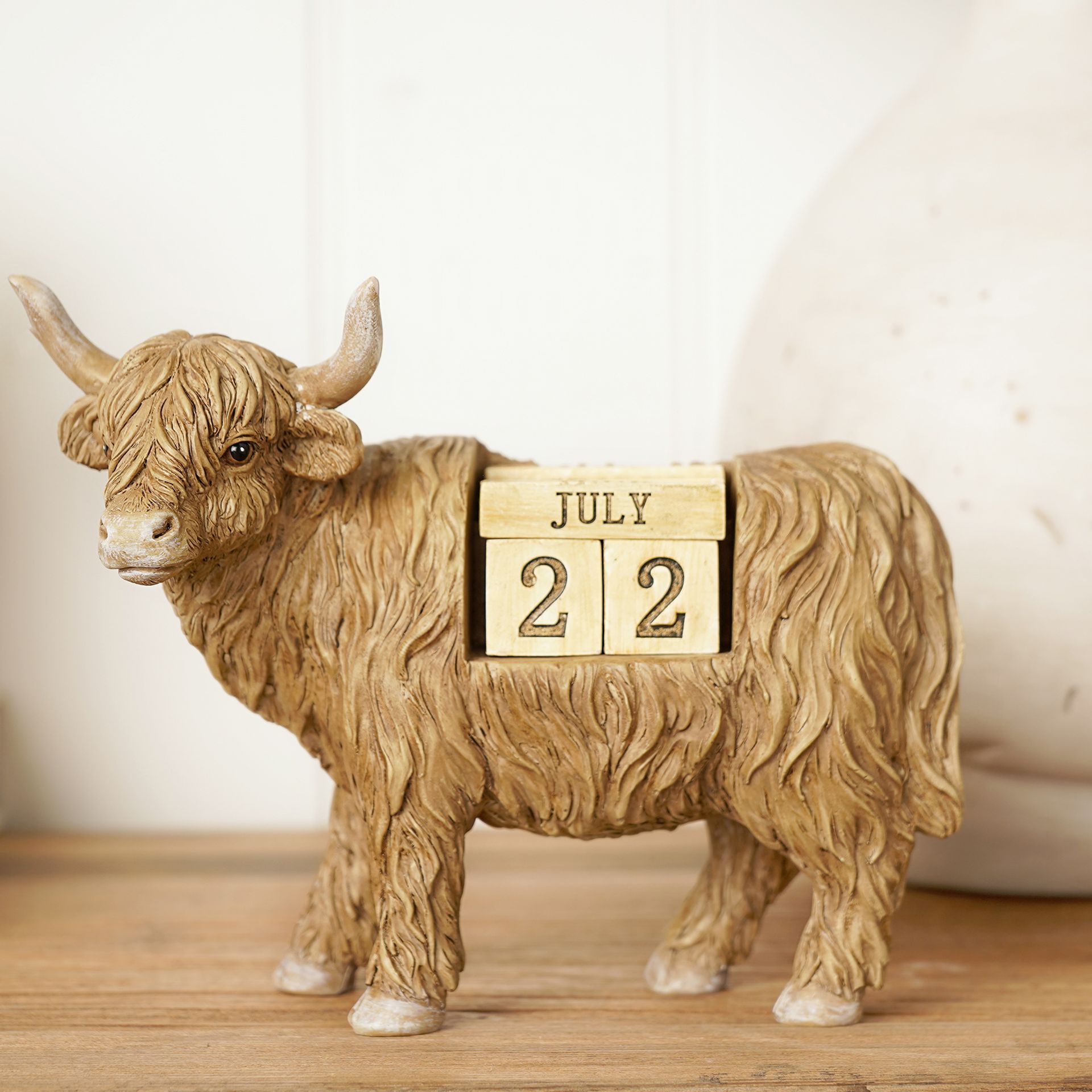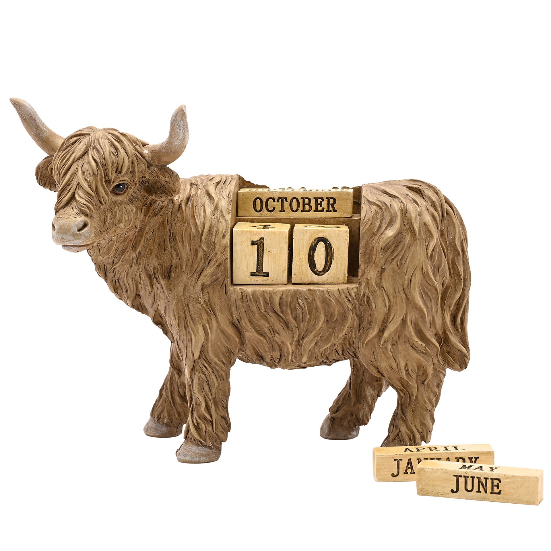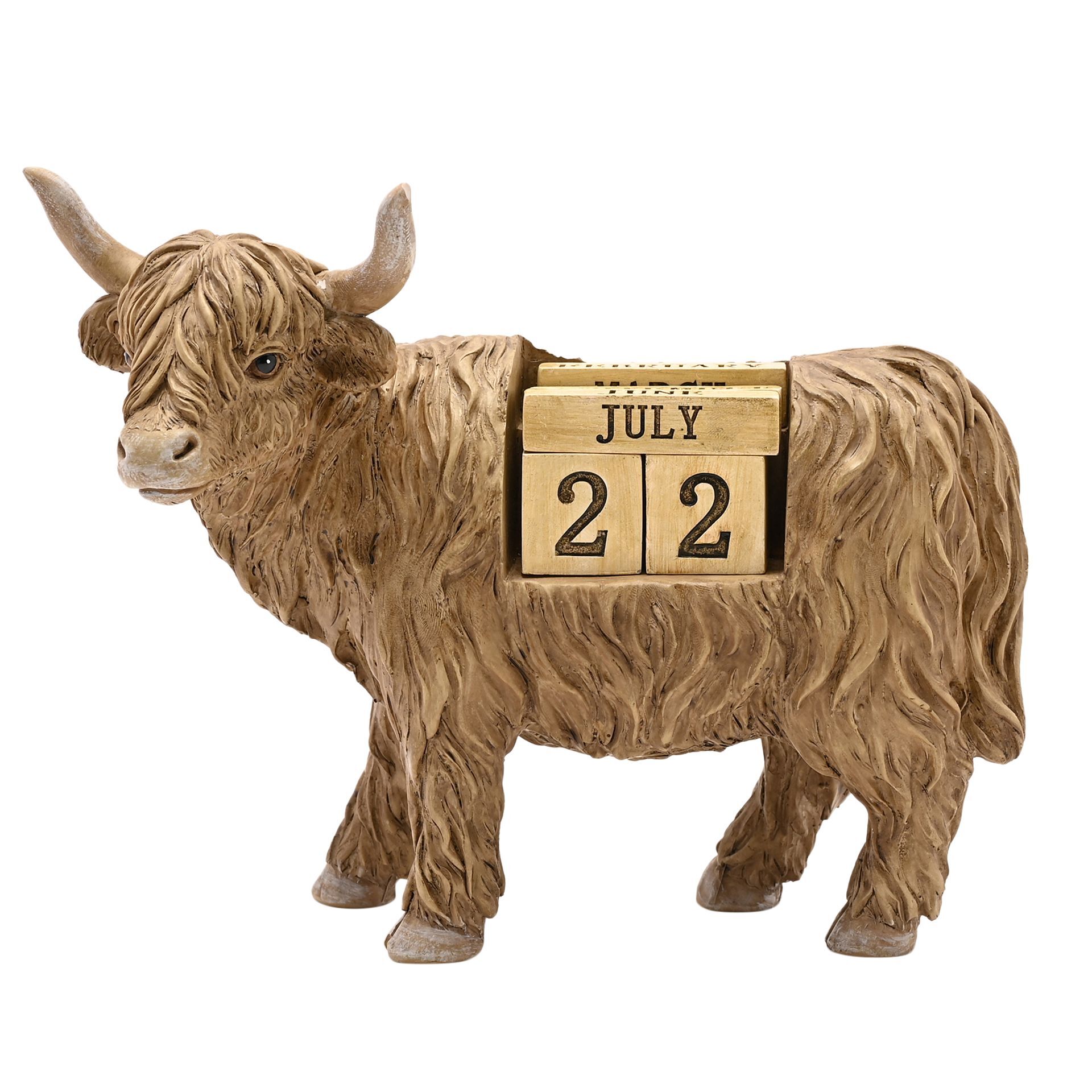 Keep track of the date in charming rustic style with this Country Living Highland Cow Figurine Calendar.