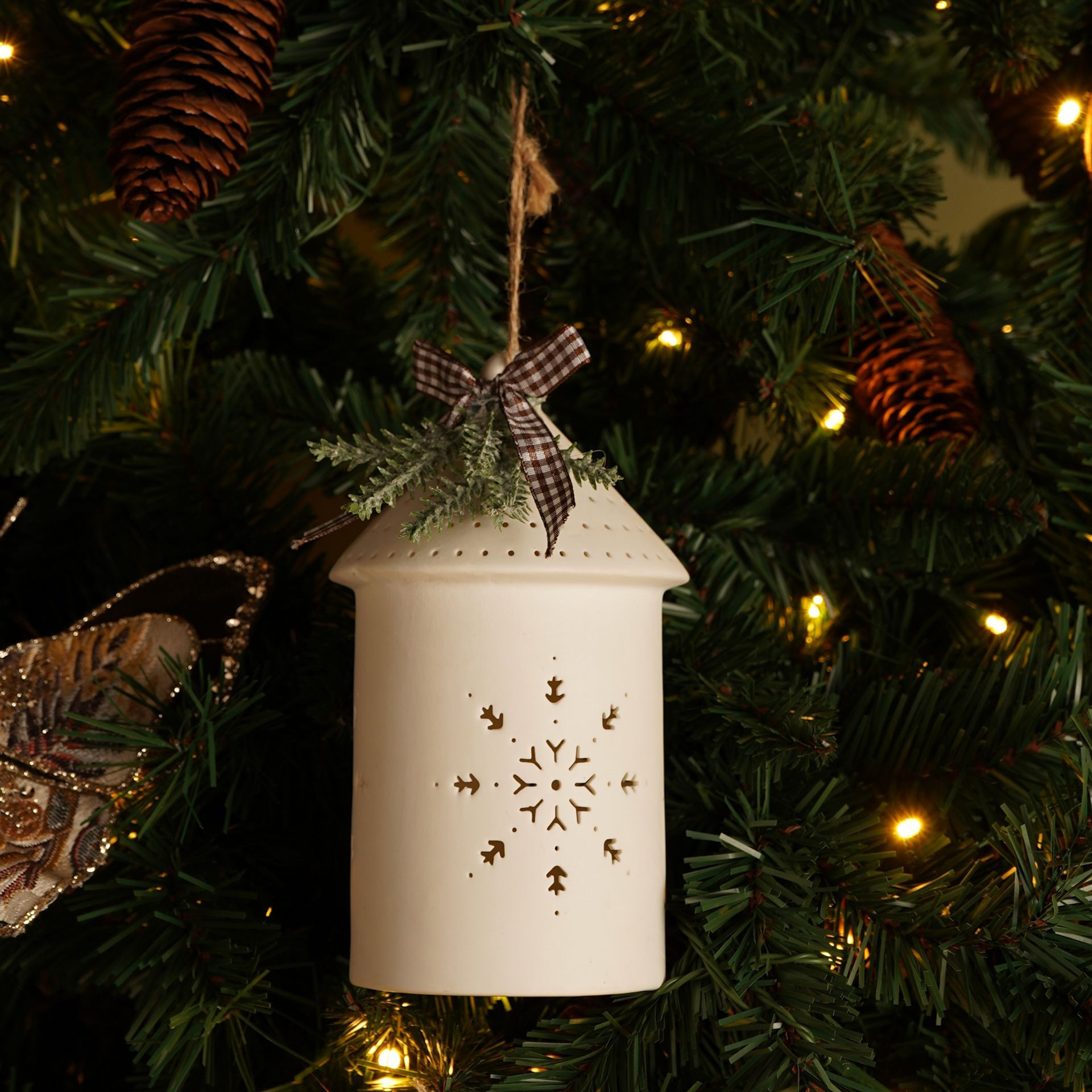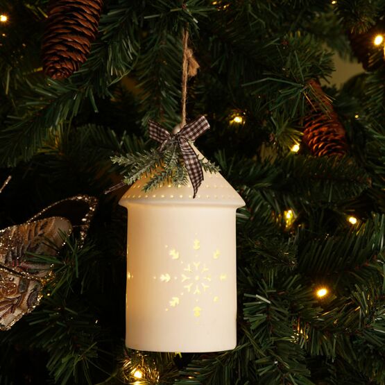 A white ceramic Christmas tree-shaped ornament with star-shaped cutouts and a brown and white checkered ribbon bow on top, softly illuminated by integrated LED lights.
