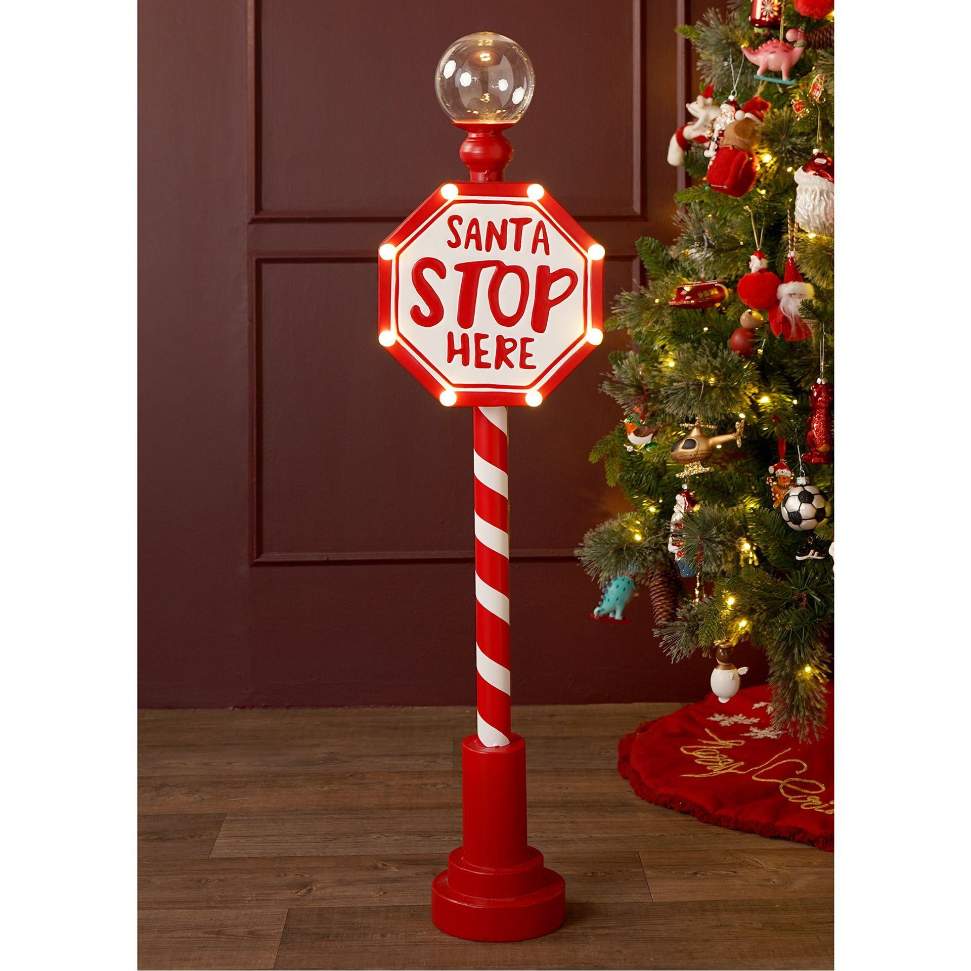 A red and white striped stop sign with the text "SANTA STOP HERE" stands on a red pole, illuminated by integrated LED lights for a cheerful, modern glow. The bold colours and crisp lines create a fun, eye-catching accent with a nod to festive nostalgia.