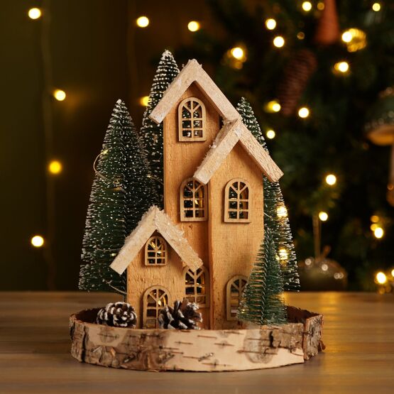 A wooden house with a pointed roof stands on a wooden base, surrounded by small pine trees and pine cones, creating a cosy and festive winter scene with warm neutral tones and organic textures.