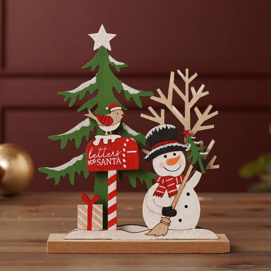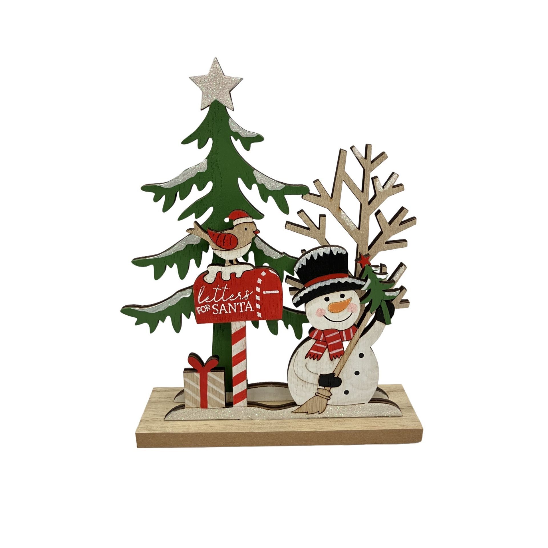 A wooden Christmas decoration featuring a cheerful snowman, layered pine-green tree, and playful signpost reading "Santa", all finished with pops of red and snowy white detail for a whimsical effect. Brings together classic festive icons with a modern, joyful twist and tactile accents.