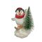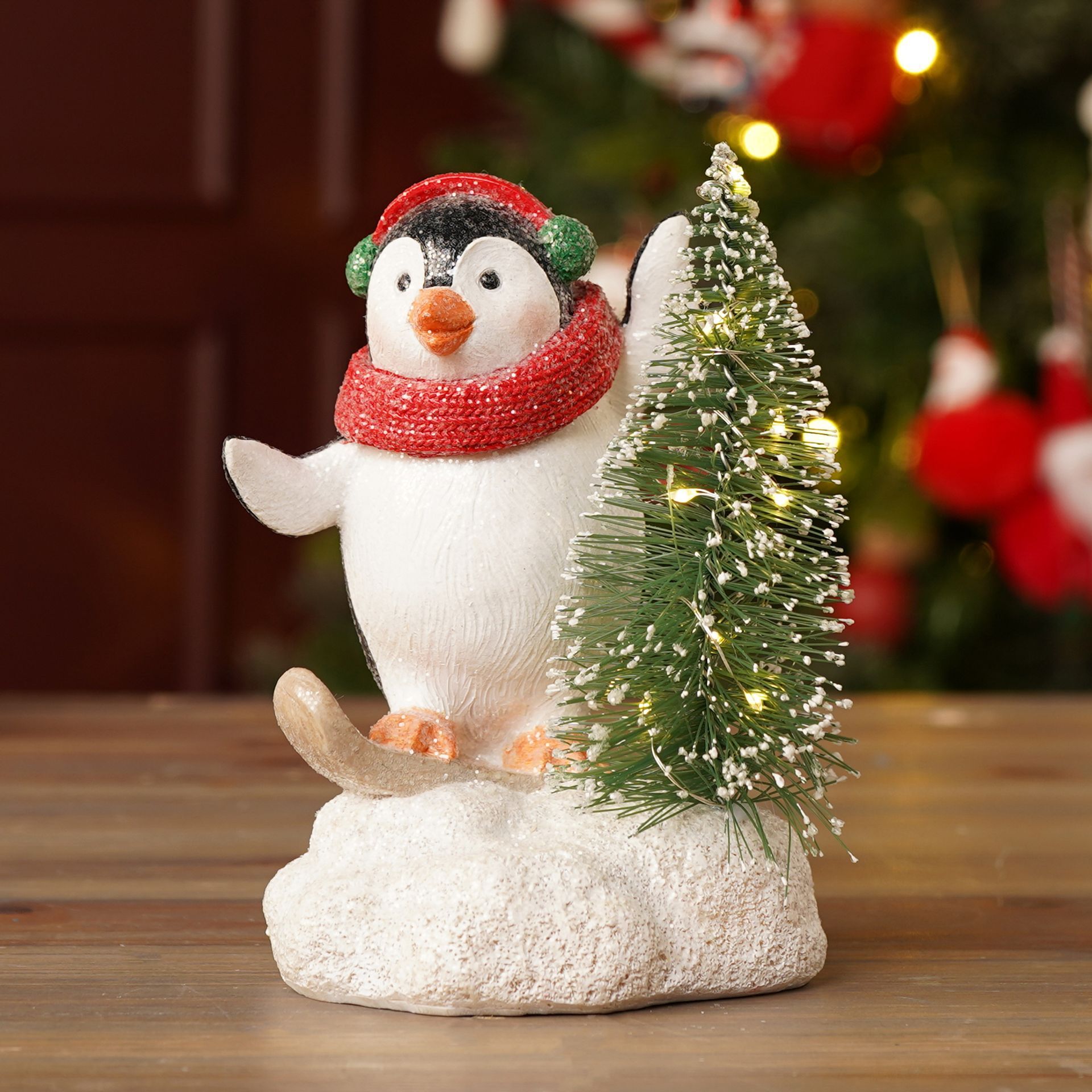 A cute, plump penguin figurine wears a bright red scarf and matching hat, standing on a snowy base and holding a small evergreen tree. The built-in LED light softly illuminates the scene, adding a gentle glow and highlighting the penguins cheerful personality.