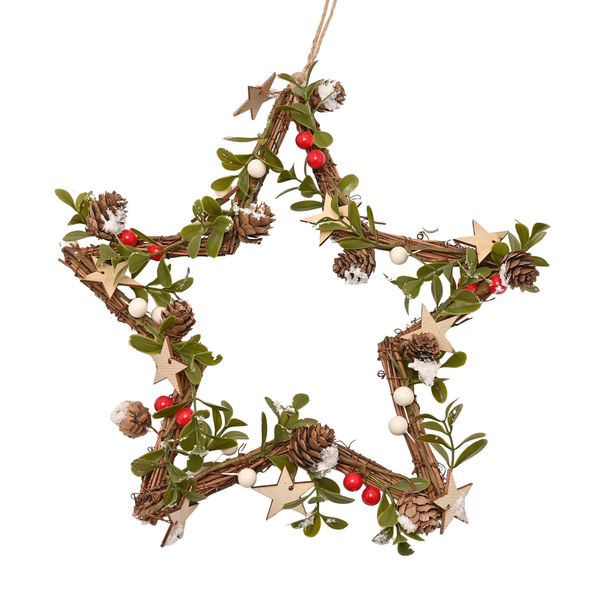 Discover our Faux Foliage And Berry Star Wreath, a rustic piece that brings nature indoors with twigs, pine cones, berries, and faux greenery.