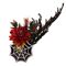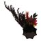 Set in a spiderweb-patterned vase, a vibrant red dahlia flower takes centre stage, surrounded by dark branches and foliage.