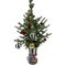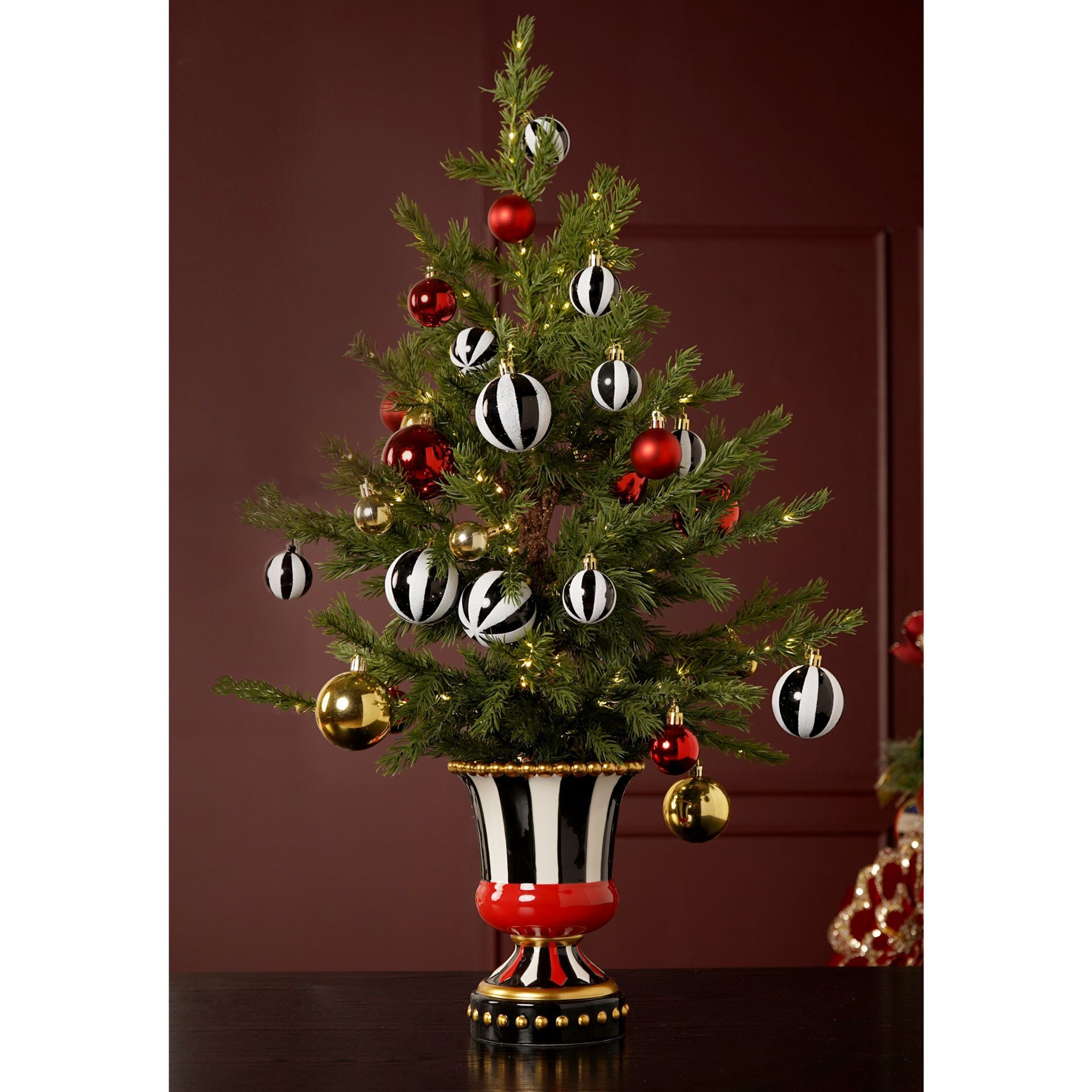 A festively decorated Christmas tree with ornaments in various shapes and colours, including red and black striped balls, stands in a decorative vase. The integrated LED lights add a gentle glow, while the try me button offers convenient illumination.