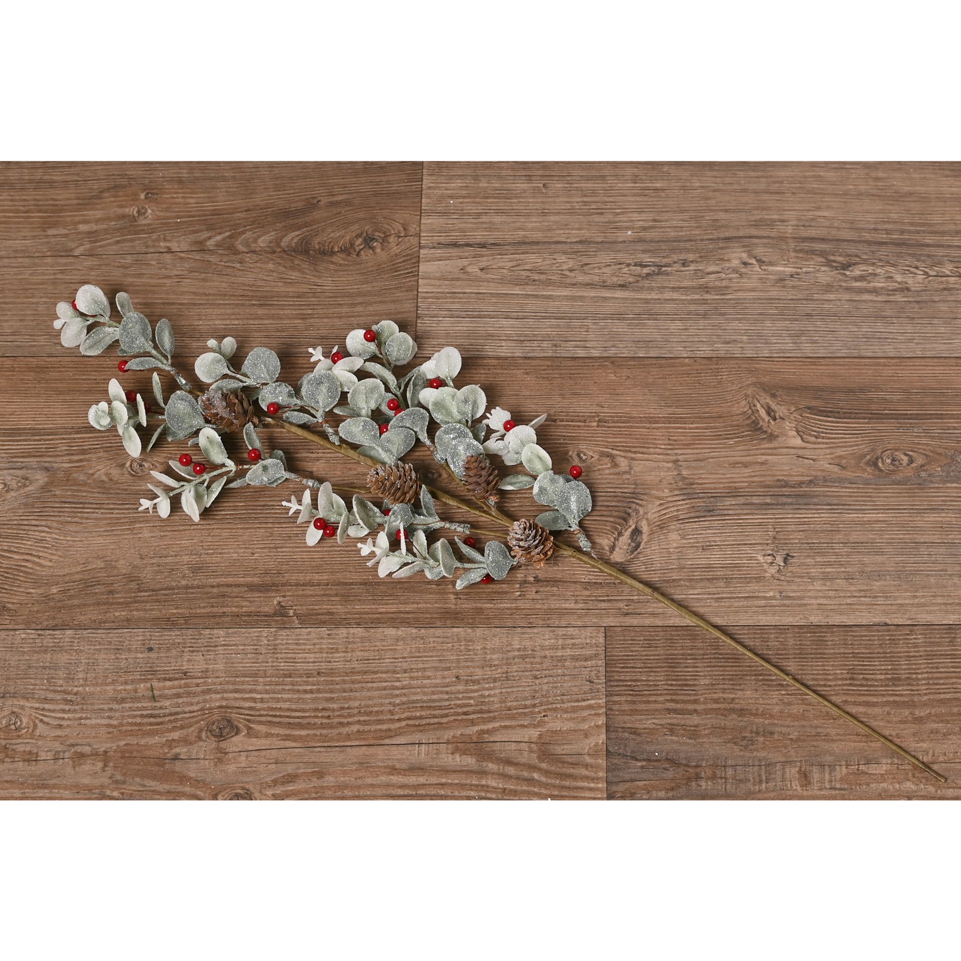 A delicate sprig of faux greenery is dusted with snowy white, punctuated by clusters of small red berries and subtle white flowers. The natural textures and muted tones evoke a rustic countryside feel, perfect for vase arrangements, wreaths, or window dressing.