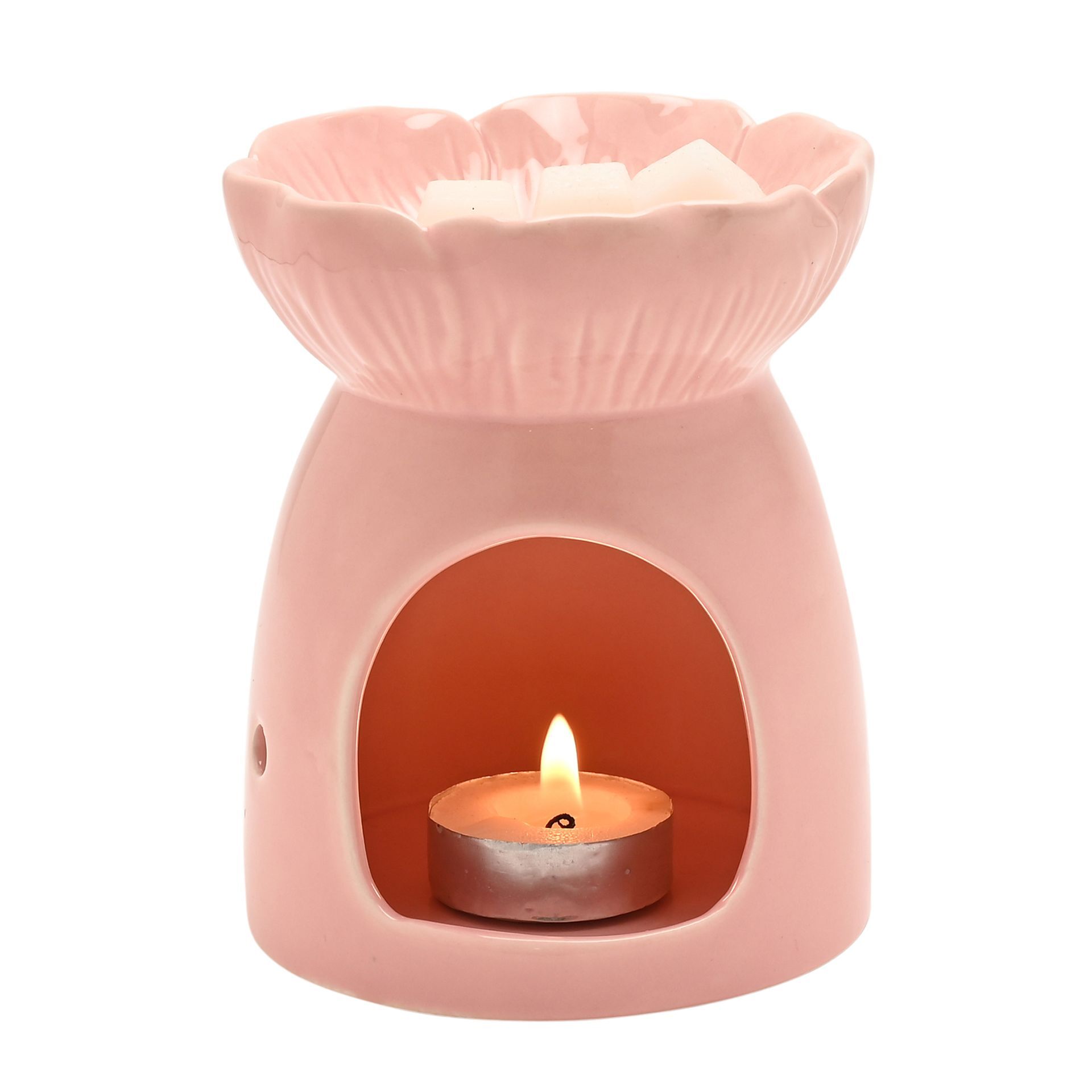The Hestia Flower Wax Melt Holder in pink ceramic is a charming room addition. Its floral shape features a recessed area for a tealight candle to warm your favorite wax melts, filling your space with fragrance.