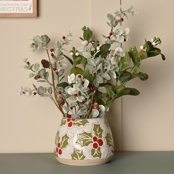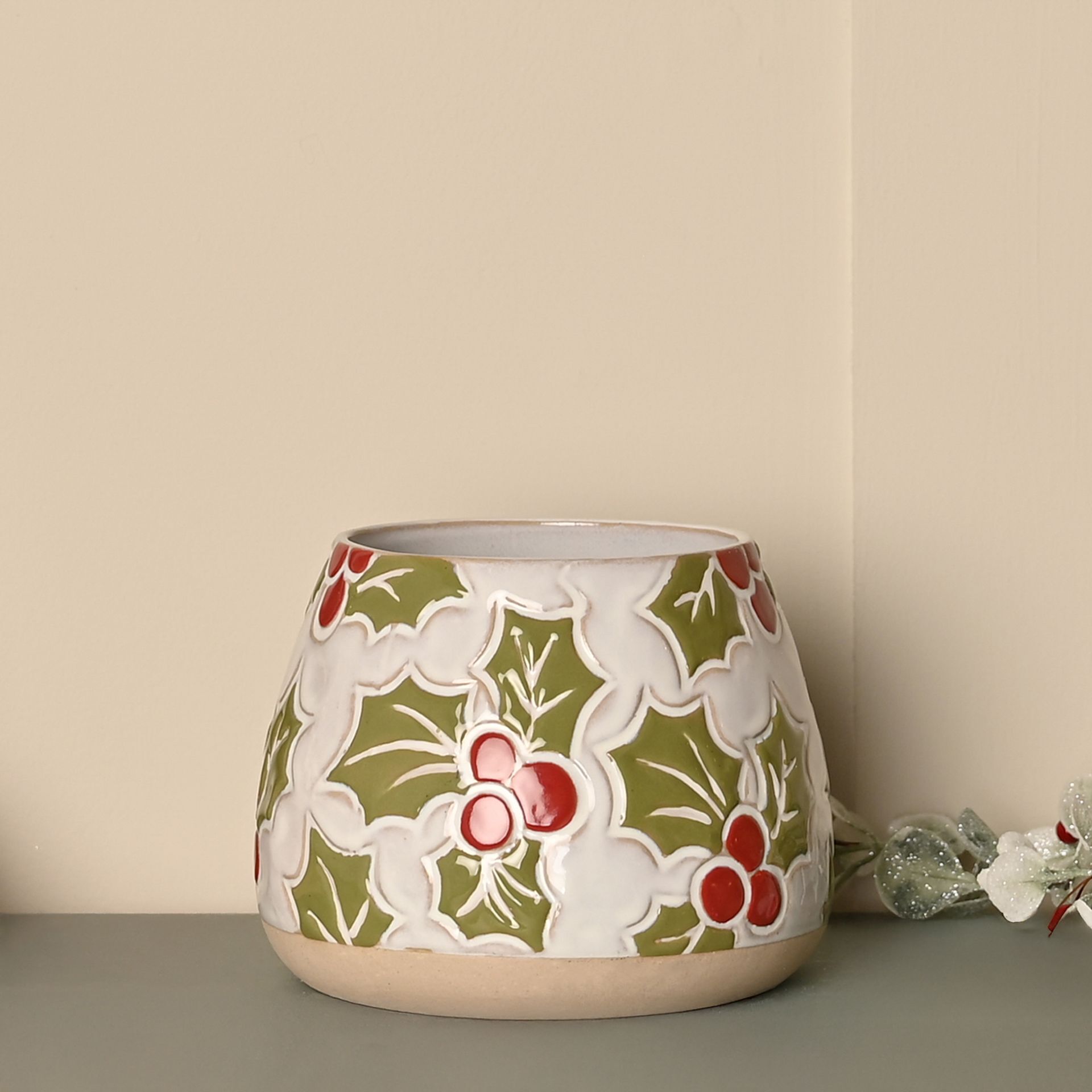 A ceramic pot featuring embossed white holly leaves and red berries stands out against a deep green background, capturing the nostalgic spirit of countryside holidays. The tactile finish and classic motif lend rustic appeal, while the generous size suits mantelpieces, tabletops, or windowsills. Perfect for showcasing festive foliage or as a standalone decorative piece.