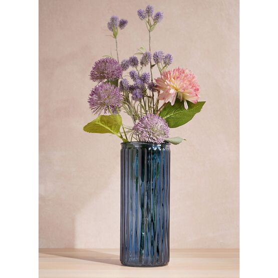 With its tall cylindrical shape and subtle vertical ribbed detailing, it catches the light beautifully and adds a refined touch to shelves, tables, or mantels. Perfect for displaying fresh or artificial flowers, the timeless design suits both modern and traditional décor.