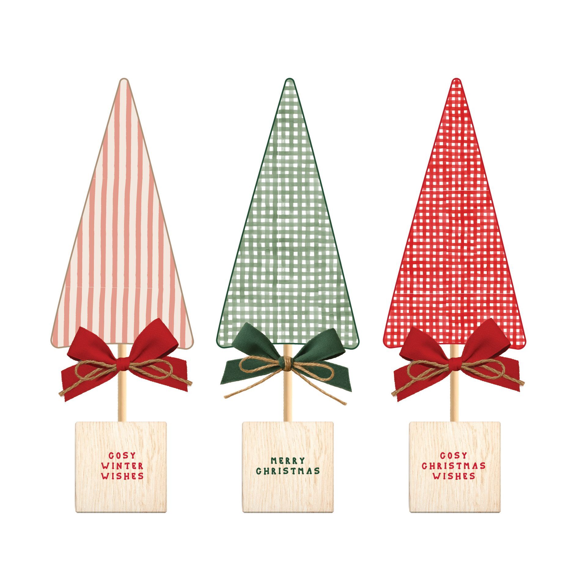 Each tree features a unique patterned fabric or paper finish, topped with a bright red bow and set on a sturdy wooden block.