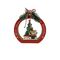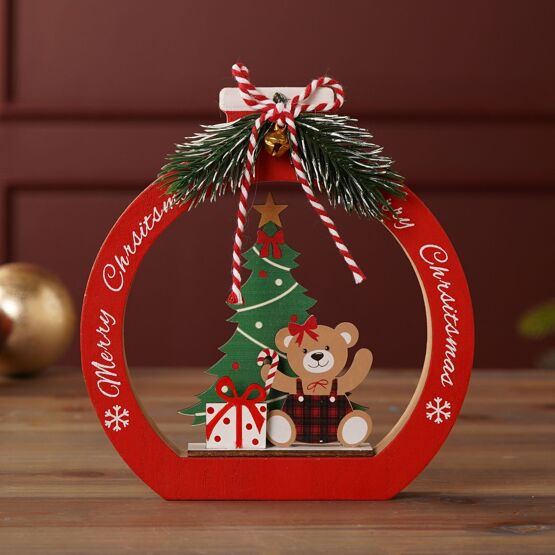 A festive Christmas wreath with a red frame, a green Christmas tree, and a teddy bears sitting underneath, adorned with a red and white striped bow. The design combines nostalgic charm with a fresh, cheerful palette, perfect for modern homes.