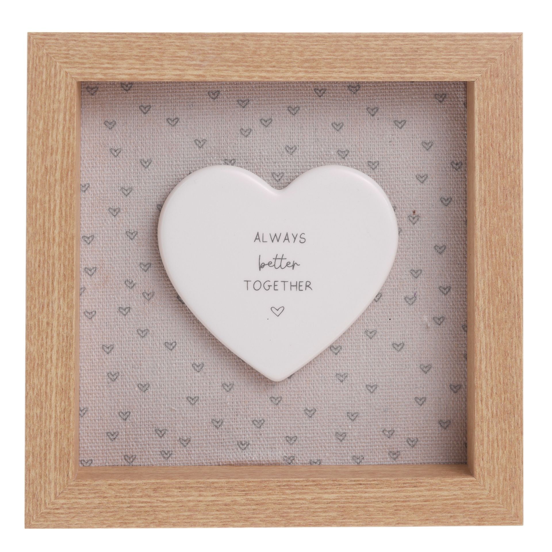 Capture the essence of unity with the Moments Framed Plaque - 'Better Together'. This charming piece features a white heart-shaped centrepiece with the sentiment 'ALWAYS BETTER TOGETHER', nestled within a wooden frame. Its background design of smaller hearts creates an artwork that's both adorable and meaningful.