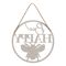 The wooden sign showcases a grey, hand painted finish, complete with a bee design and cut-out ‘Bee Happy’ title. It is designed for display using the attached rope hanger.