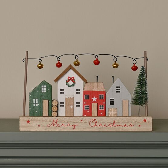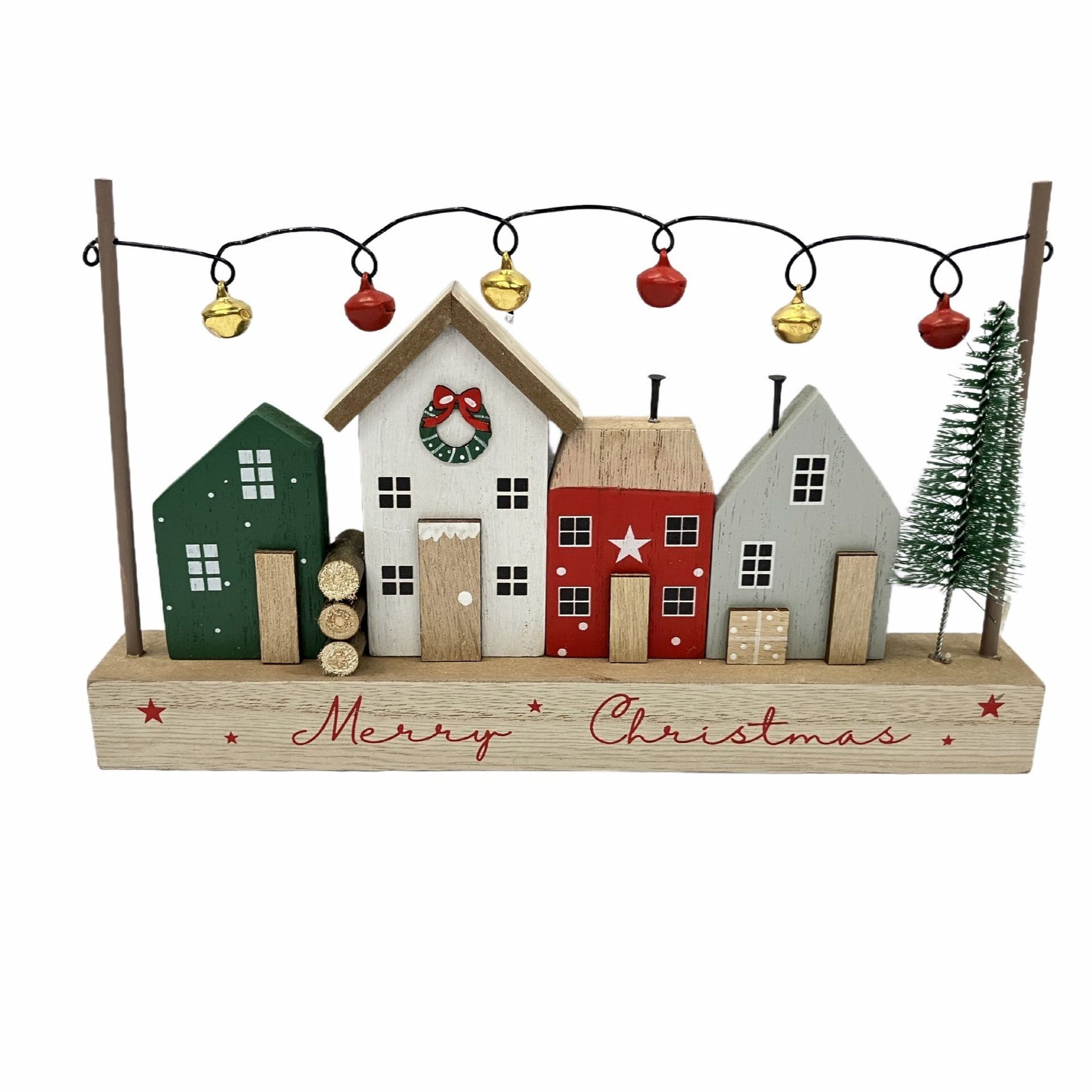 A row of small wooden cottages in soft wintry tones sits beneath hanging ornaments and bells, with a “Merry Christmas” message nestled among miniature evergreen trees. Compact and versatile, it’s ideal for mantelpieces, shelves, or window ledges, offering instant countryside warmth and shelf appeal.
