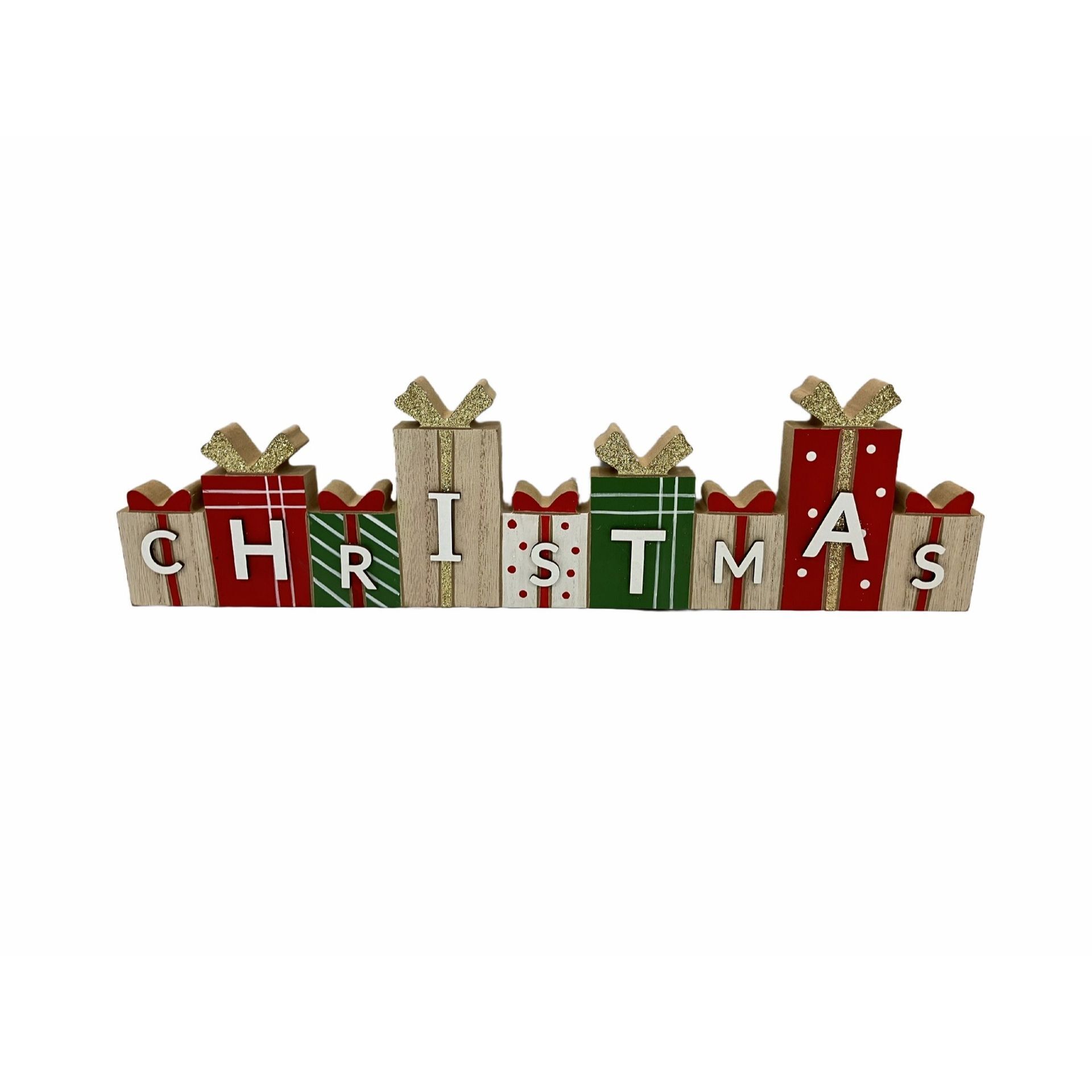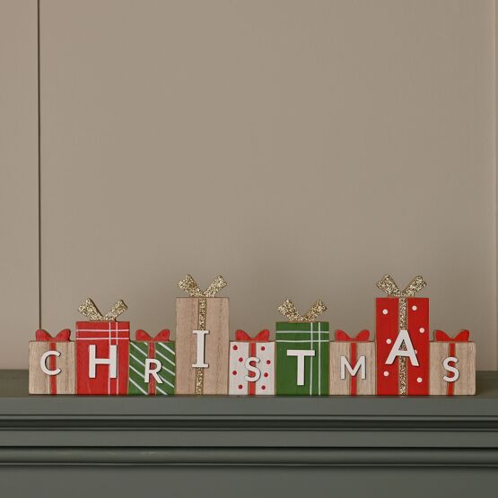 Wooden blocks spell out Christmas in rustic lettering, accented with red and green gift cutouts for a pop of colour and dimension. The clean lines and handcrafted-inspired finish give it a warm, countryside feel, ideal for mantelpieces, shelves, or shop windows looking to capture classic seasonal style.